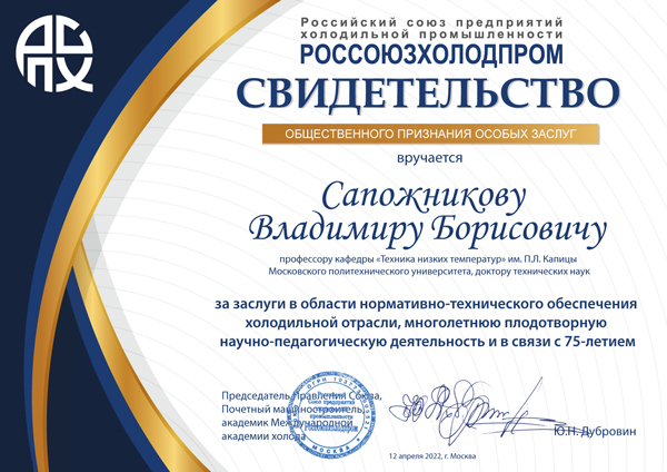 Члену Правления Россоюзхолодпрома, профессору кафедры «Техника низких температур» им. П.Л. Капицы Московского политехнического университета, д.т.н. Сапожникову В.Б