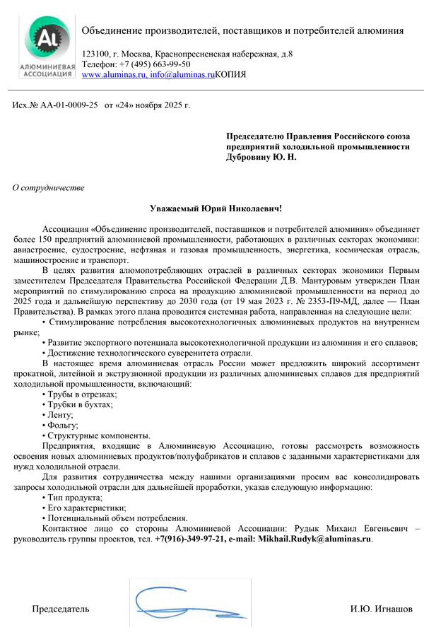 В настоящий момент Россоюзхолодпром развивает сотрудничество с Ассоциацией «Объединение производителей, поставщиков и потребителей алюминия».