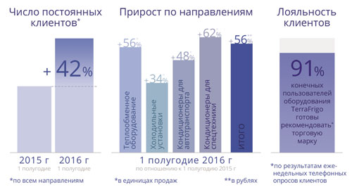 Одним из самых успешных направлений компании в 2016 г стало производство и продажа кондиционеров и комплектующих для спецтехники — прирост составил 62%! Возможность предлагать решения для нестандартных ситуаций, широкий ассортимент запчастей и весомые преимущества перед каждым конкурентом в отрасли позволяют «Заводу ТерраФриго» завоевывать лояльность все большего количества аграриев страны — за 6 месяцев 2016 г число постоянных клиентов в сегменте возросло на 40%!