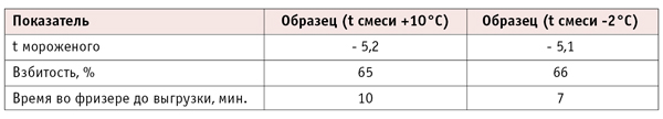 Как показали исследования, при фризеровании смеси с t 10оС и -2°С способность смеси к насыщению воздухом не изменилась. Однако продолжительность фризерования до достижения одной и той же температуры отличалась в 1,4 раза.