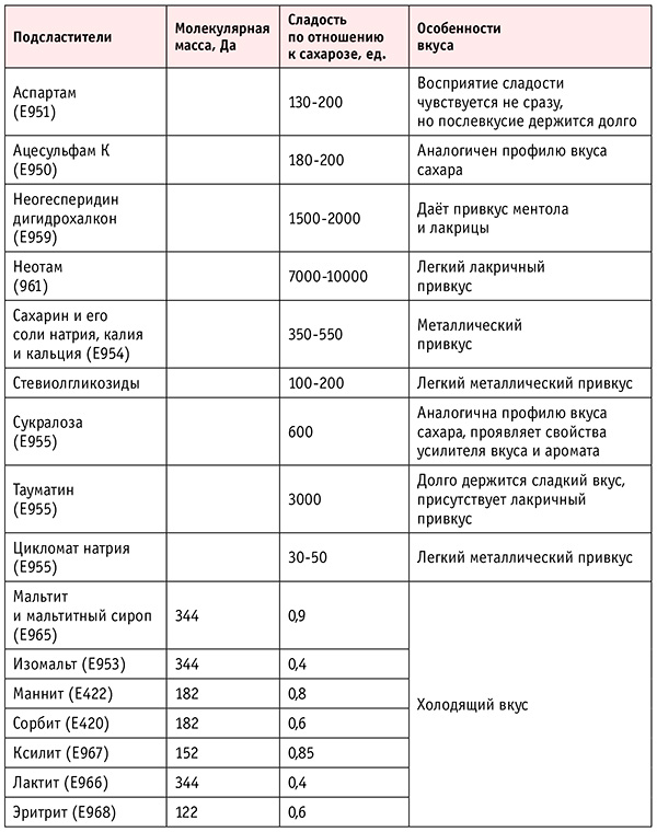 Табл. 1. Свойства подсластителей, разрешенных к применению в мороженом