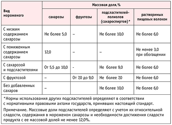Инулин применяется в количестве не более 6%. В ГОСТ 35282 регламентируется количество компонентов, применяемых в производстве мороженого для замены сахарозы по сладости и сухому веществу в виде конкретного требования (табл. 2).
