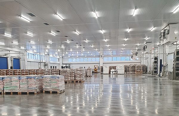 Объект предназначен для хранения мясной продукции при температурах –15, –35 и –43°C. Холодопроизводительность системы составляет 5,7 МВт, заправка аммиака — около 22 тонн. Изначально проектировалась каскадная схема NH3/CO2, однако в связи с ограниченной доступностью оборудования мы сделали систему полностью на аммиаке.