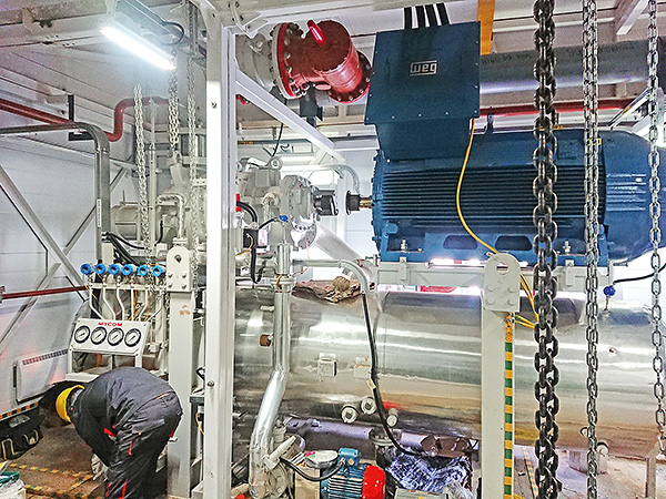 Для туннеля закалки мороженого непрерывного действия система холодоснабжения выполнена на базе винтового сальникового двухступенчатого компрессорного агрегата MYCOM холодопроизводительностью 360 кВт при температуре кипения –50°С. Энергопотребление компрессора составляет 345 кВт.