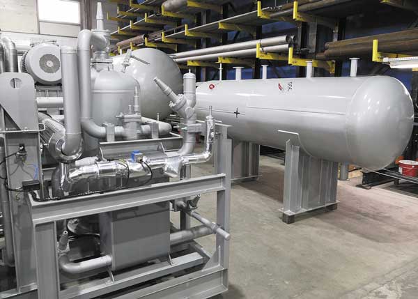 Один из таких заказов — два холодильных многокомпрессорных агрегата на базе открытых винтовых компрессоров OSN8591-К фирмы BITZER, суммарной холодопроизводительностью 500 кВт при температуре кипения t0=-45оC. Данные агрегаты работают на общий циркуляционный ресивер объемом 11 м3. Подача хладагента к потребителям осуществляется посредствам насосов HRP10080 фирмы WITT. Для защиты от воздействия агрессивной среды агрегат полностью, включая компрессоры, покрашен защитным покрытием Temadur, широко применяемым на морских судах. Для защиты теплоизоляции от механических повреждений и воздействия ультрафиолета использованы кожухи из нержавеющей стали AISI 304L толщиной 0,45мм, выполненные на заводе «ТехноФрост».