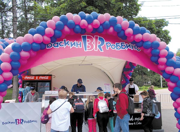 Тот, кто хотел полакомиться новыми вкусами продукции «Баскин Роббинс», искал павильоны с сине-розовым логотипом компании.